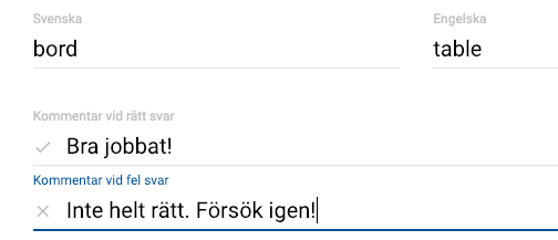 Om du väljer Skriv rätt svar skriver du in ordet på det språk du vill översätta från (i detta fall svenska). Därefter den (i detta fall) engelska översättningen som är målordet för övningen. Om ett ord har synonymer kan du lägga till dessa med hjälp av ett kommatecken. Eleven kan du få rätt oavsett vilken översättning han eller hon skriver in. Du kan även skriva in en hel fråga, t.ex. “När dog Gustav Vasa?”. Eller “Vad heter Frankrikes huvudstad?”. Eleven svarar då med ett årtal eller med ett ord.