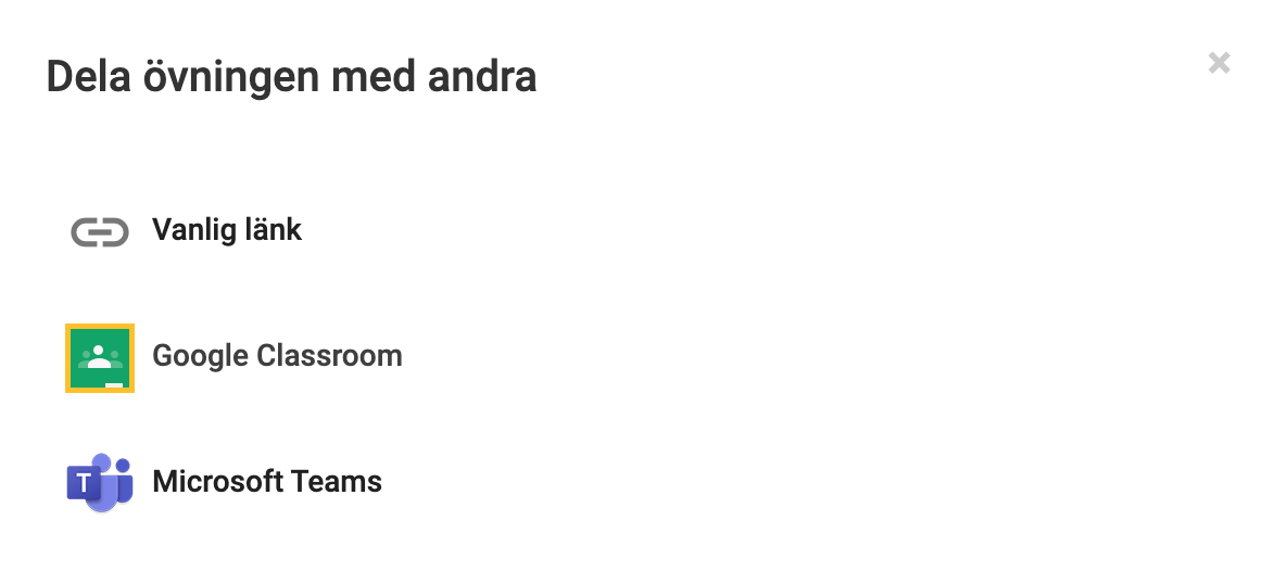 Det finns tre olika sätt att dela din kurs och/eller övning på efter att du tryckt på delaknappen: