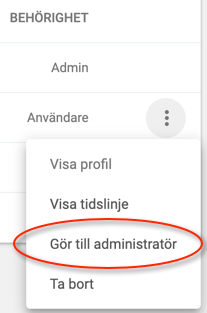 Du kan välja att göra en särskild deltagare till administratör tillsammas med dig, t.ex. en kollega som du vill ska få tillgång till din övning och/eller kurs. Båda har då samma rättigheter att redigera i övningen. Klicka på de tre punkterna till höger om en deltagare och välj Gör till administratör. Det är även här du åter kan göra deltagaren till vanlig användare.