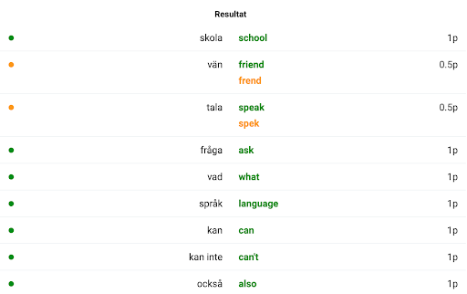 Alla orden måste skrivas in korrekt och i rätt ordning, både om eleven ska få helt rätt i övningsläget samt i läxförhörsläget.