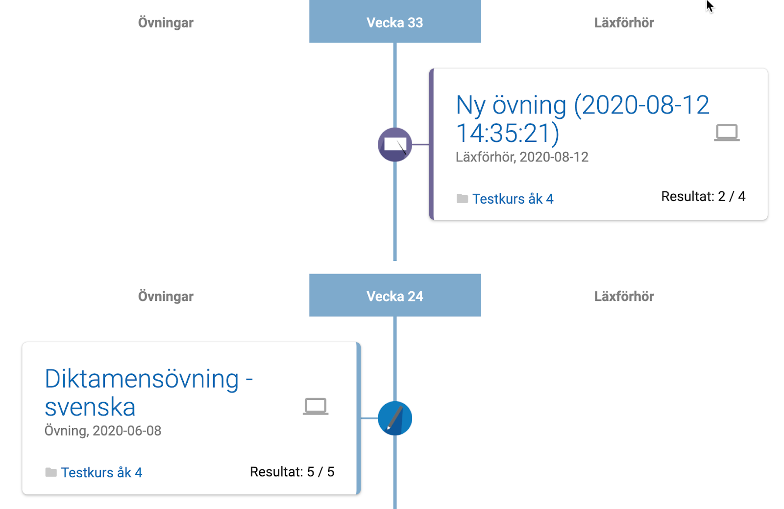 Övningarna kommer att ligga till vänster om mittlinjen och läxförhören till höger. De olika symbolerna visar vilket övningsläge som använts. Klicka på titeln till övningen för att komma in i övningen igen eller på titeln till läxförhöret för att se ditt resultat.