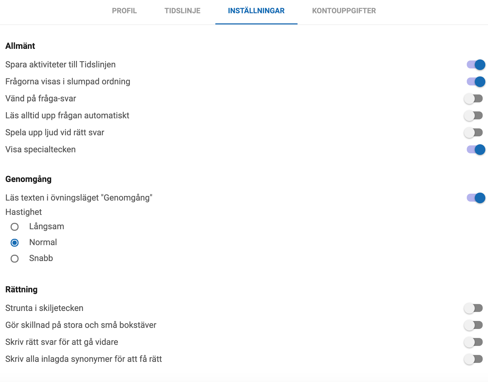Under Inställningar ställer du in olika generella alternativ för hur du vill att Glosboken ska bete sig när du själv övar. Detta är främst funktioner som eleverna kan använda sig av i övningsläget. De gäller således inte som generella inställningar i de övningar eller läxförhör som du som lärare skapar till eleverna.