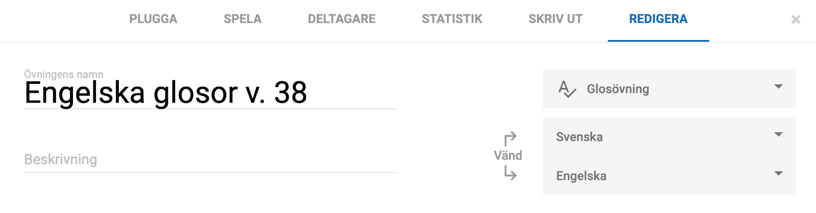 När du klickar på Skapa övning hamnar du i övningens redigeringsläge. Det är i detta läge som du skapar dina olika uppgifter för eleverna. Namnge övningen, t.ex. Engelskaglosor v. 5.